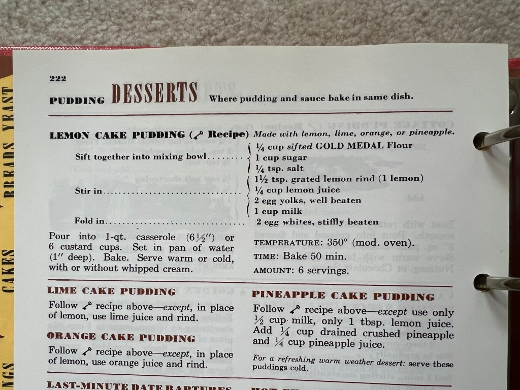 - The recipe for the Lemon Cake Pudding is SO OLD I can’t find a link to it! So here’s a picture from my Mom’s copy of the Betty Crocker Cookbook: